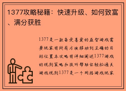 1377是一款备受喜爱的益智游戏,需要玩家将所有方块移动到正确的目标位置。本攻略将详细阐述1377游戏的规则、策略和技巧,帮助你轻松通关。